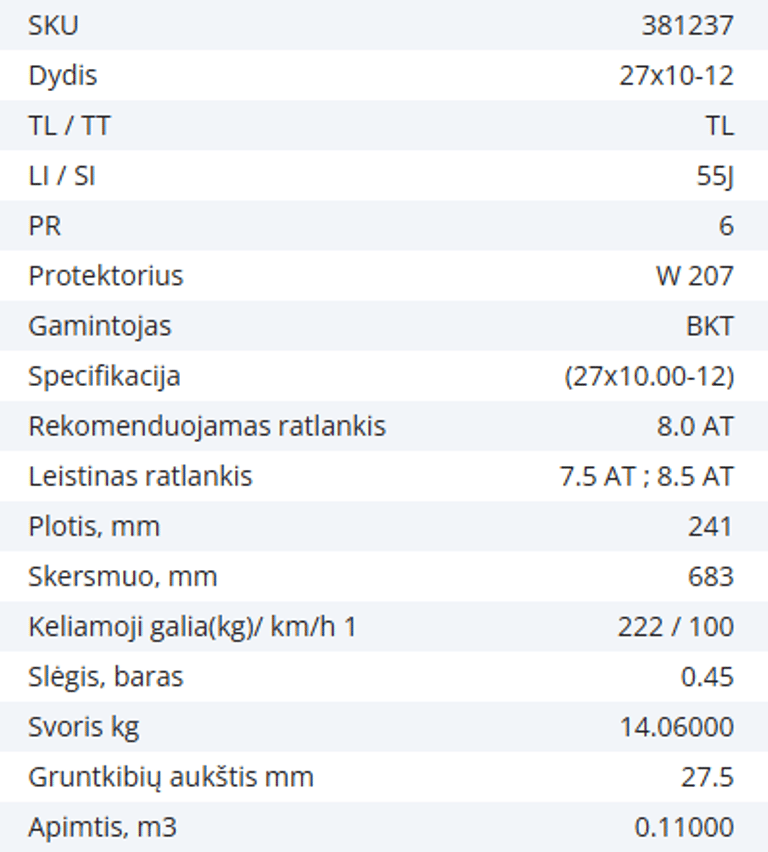 Pneumatinė padanga 27X10-12 (27X10.00-12) 6PR BKT W 207 55J TL