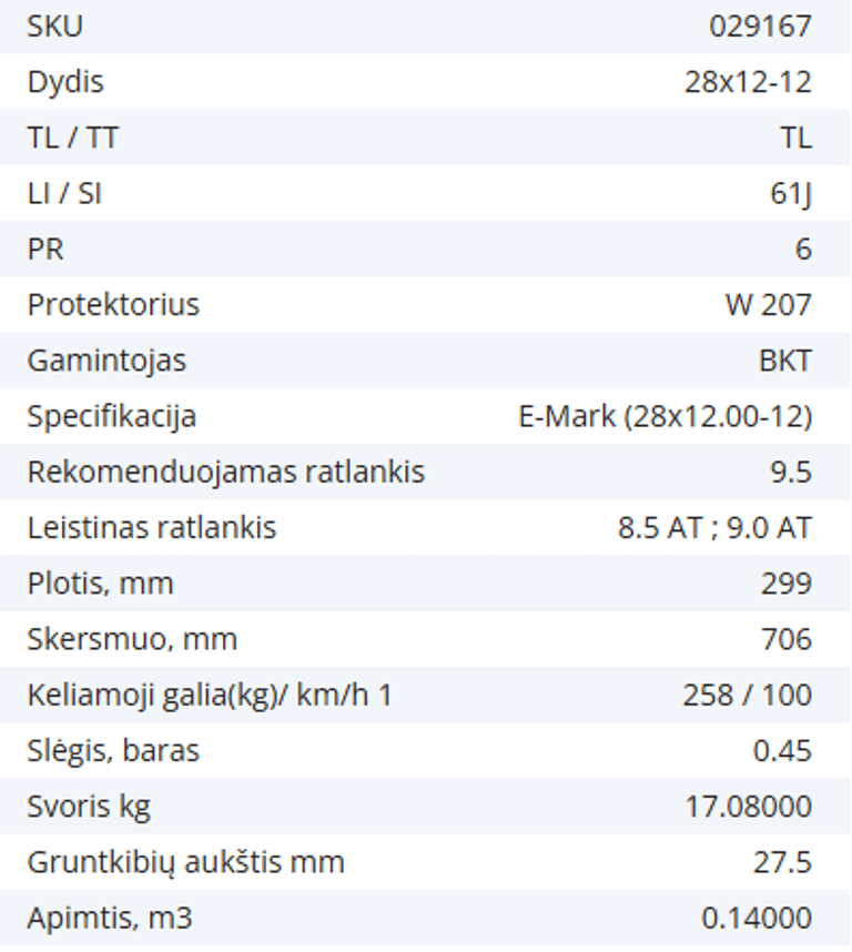 Pneumatinė padanga 28X12-12 (28X12.00-12) 6PR BKT W 207 61J TL