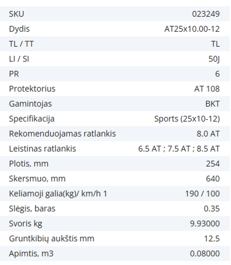 Pneumatinė padanga AT25X10.00-12 (25X10-12) 6PR BKT AT 108 50J TL