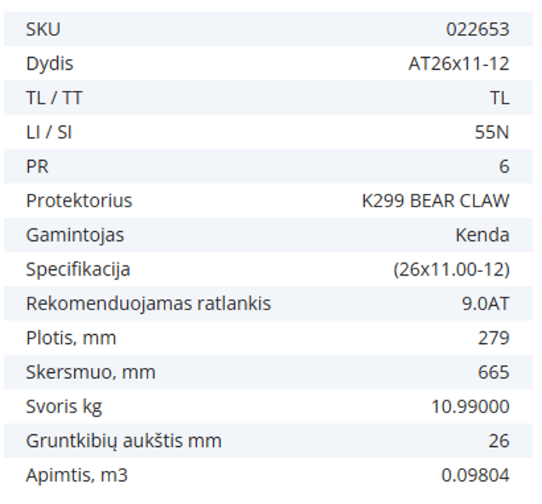 Pneumatinė padanga AT26X11-12 (26X11.00-12) 6PR KENDA K299 BEAR CLAW TL 26x11.00-12