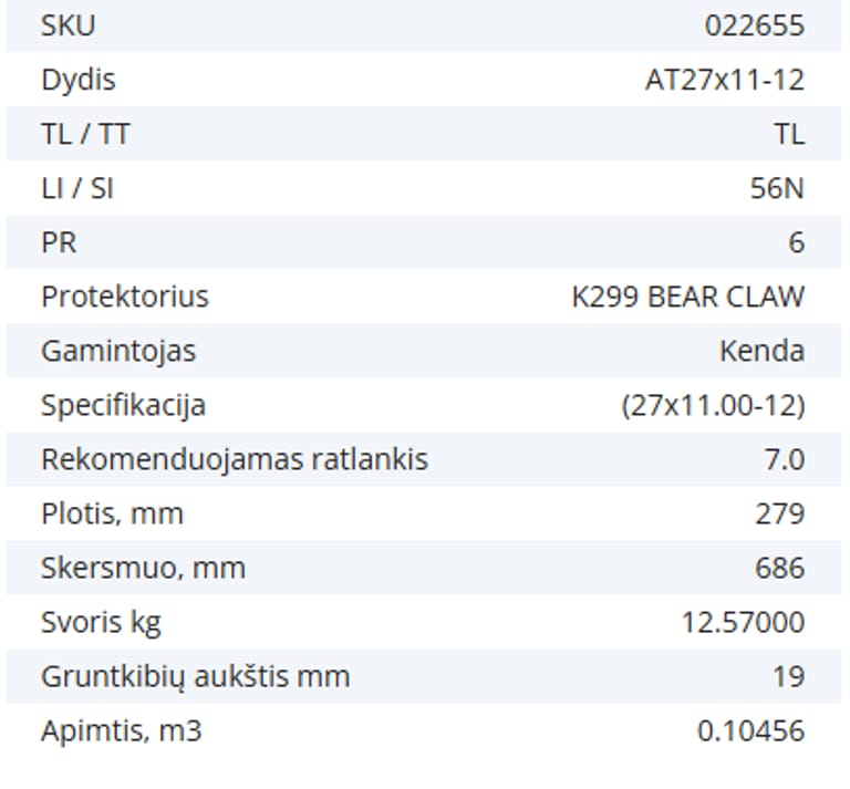 Pneumatinė padanga AT27X11-12 (27X11.00-12) 6PR KENDA K299 BEAR CLAW 56N TL 27x11.00-12